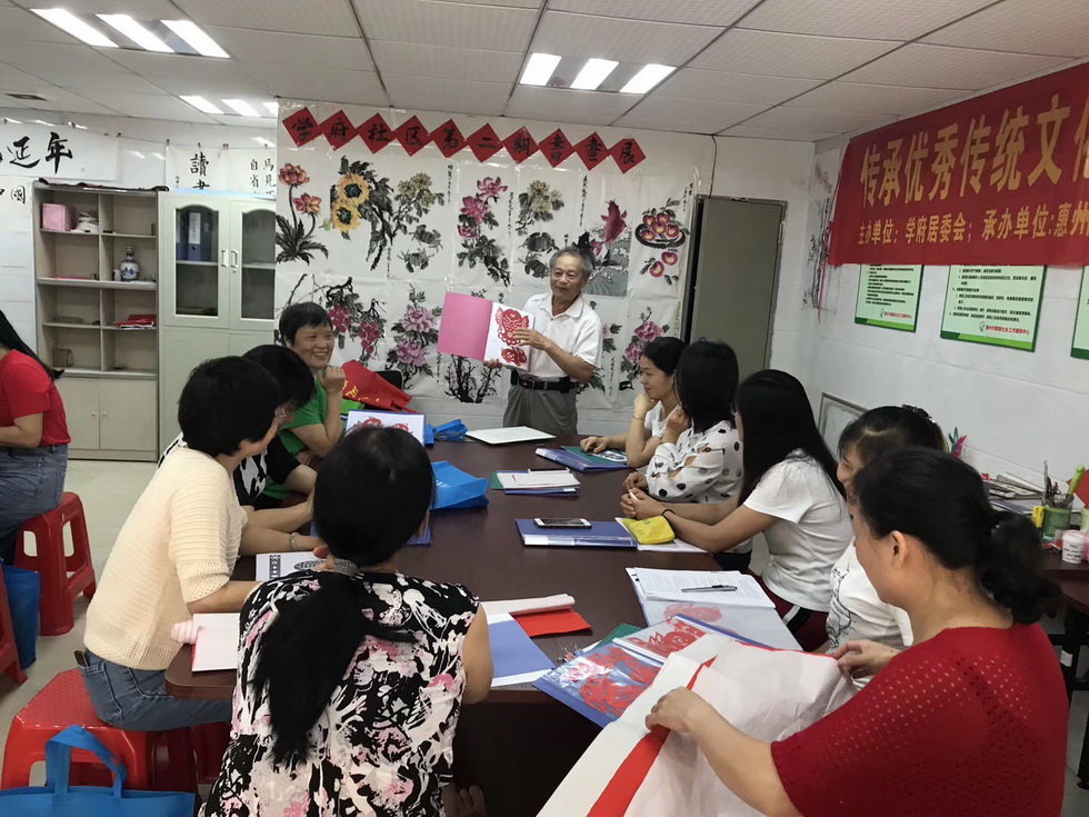 陈老师的剪纸作品曾入选省首届民间工艺博览会,曾获省级剪纸作品展铜奖,传承和发展惠州剪纸艺术特色。他热心公益,多年来都义务为社区居民开班培训剪纸,陈老师不但剪纸技艺精湛,授课经验也相当丰富。据悉,此次剪纸公益课程将持续至7月,每周四下午开课,旨在提高社区居民的动手能力,提高艺术鉴赏能力,感受中华民族传统文化艺术魅力。市社区教育指导服务中心今后将继续致力于开展,传承民俗技艺,传播传统文化,共同提高社区居民整体素质。