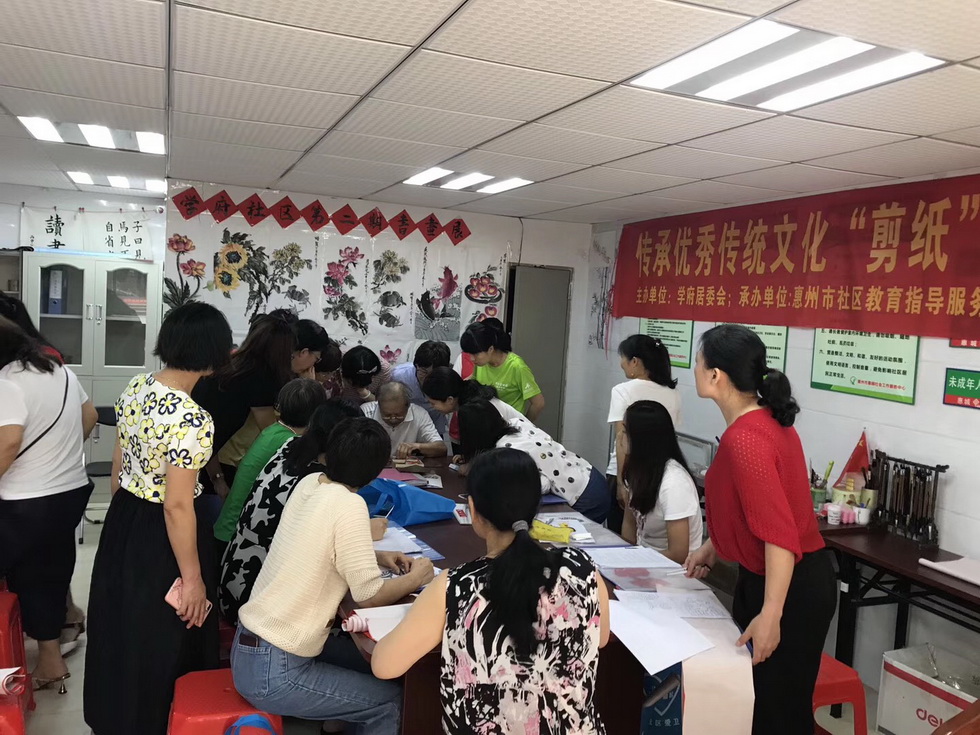 为进一步丰富社区居民的精神文化生活,4月18日下午,惠州市电大(市社区教育指导服务中心)与东江学府社区联合开展剪纸公益课程活动,邀请惠州市老年大学剪纸研究会会长、市民间文艺家协会会员陈子毅老师授课,20多名社区居民参加。