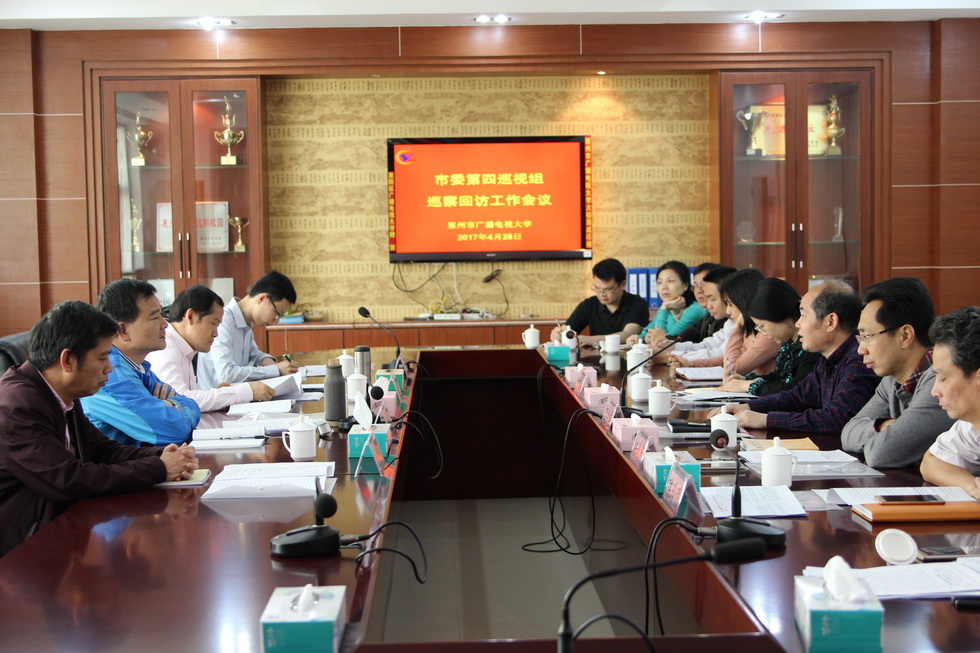 4月28日,市委第四巡察组组长钟金彪一行莅临惠州电大开展巡察回访工作,对2016年巡察电大的反馈意见整改落实情况进行“回头看”。市电大党委书记、校长温金龙、副校长杨祖武、范慧新、陈玲明及学校中层正职参加了巡察回访会议。