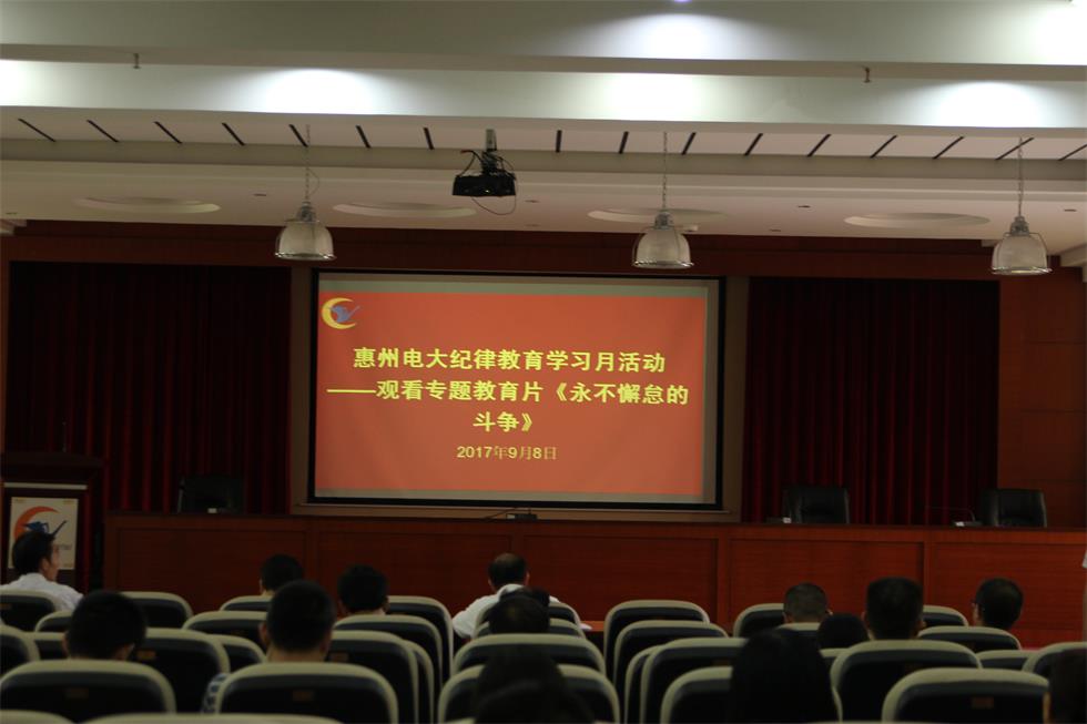为深入推进“纪律教育学习月”活动,提升干部职工拒腐防变和廉洁自律的意识,9月8日,惠州市电大组织全体党员集中观看了全面从严治党电视专题片《永不懈怠的斗争》。
