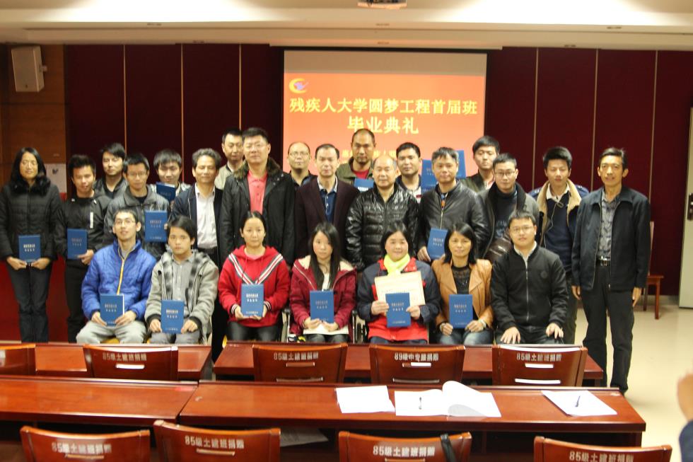 12月16日,惠州电大在综合楼801室举行残疾人大学圆梦工程首届班毕业典礼。市残联党组书记、理事长曾建廷,副理事长魏刚,惠州电大党委书记、校长温金龙,副校长陈玲明、李建国出席典礼,20名残疾人或残疾人工作者拿到大专文凭,圆了大学梦。