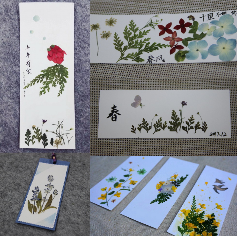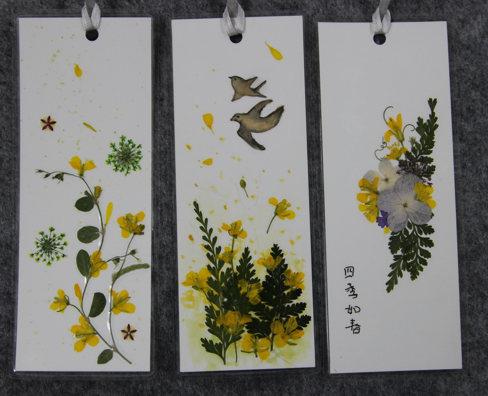 押花做出来的工艺品可用来装饰家居,为居室增添一些大自然的气息,又使其显得高雅;用来当做礼物送给亲友,更是显得别出心裁。书签制作完毕后,大家在书签上写下了新年愿望,或者自己喜欢的其它词句,作为给自己的新年礼物。