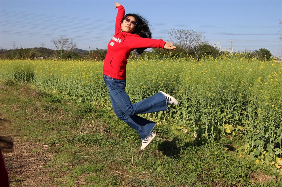 当天下午2时,风和日丽,20多名女教职员工启程前往墨园村。一路上,她们留下了阵阵欢声笑语。到了墨园村后,首先映入眼帘的是一大片油菜花地,开满了金黄的油菜花。在油菜花海中,女教职员工尽情遨游,展现了她们的活力。“我们全部都跳起来,再照一张!”“我们来拍背影,然后手摆出不同的姿势吧!”女教职员工们在拍照时讨论并摆出她们理想的姿势,她们有的举目眺望,有的舞动着手中的围巾高高跃起……相机、手机和自拍杆记录下了她们一个个欢乐的瞬间。