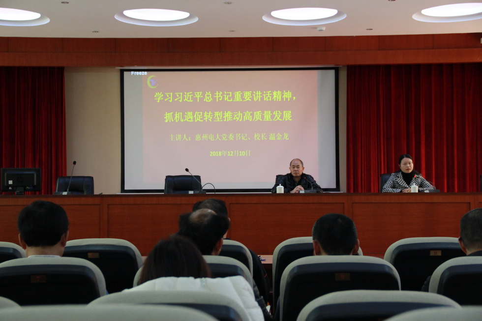 12月10日下午,惠州电大(建筑学校)在12楼多功能报告厅召开全校教职工大会,深入学习贯彻习近平总书记视察广东重要讲话精神,推动学校高质量发展。党委书记、校长温金龙,副校长范慧新、陈玲明、李建国、张紫良,以及全体教职员工参加会议。