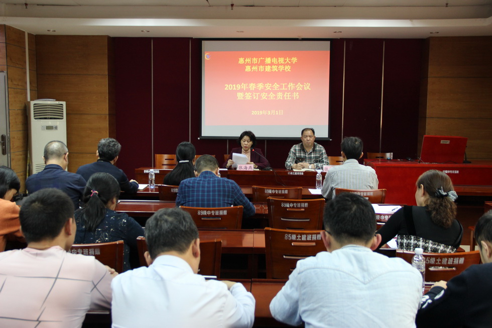 3月1日下午,惠州市电大(建筑学校)在综合楼802室召开2019年春季安全工作会议,学校领导、安全办成员、各部门负责人及安全联络员共30人参加了会议。会议由张紫良副校长主持。