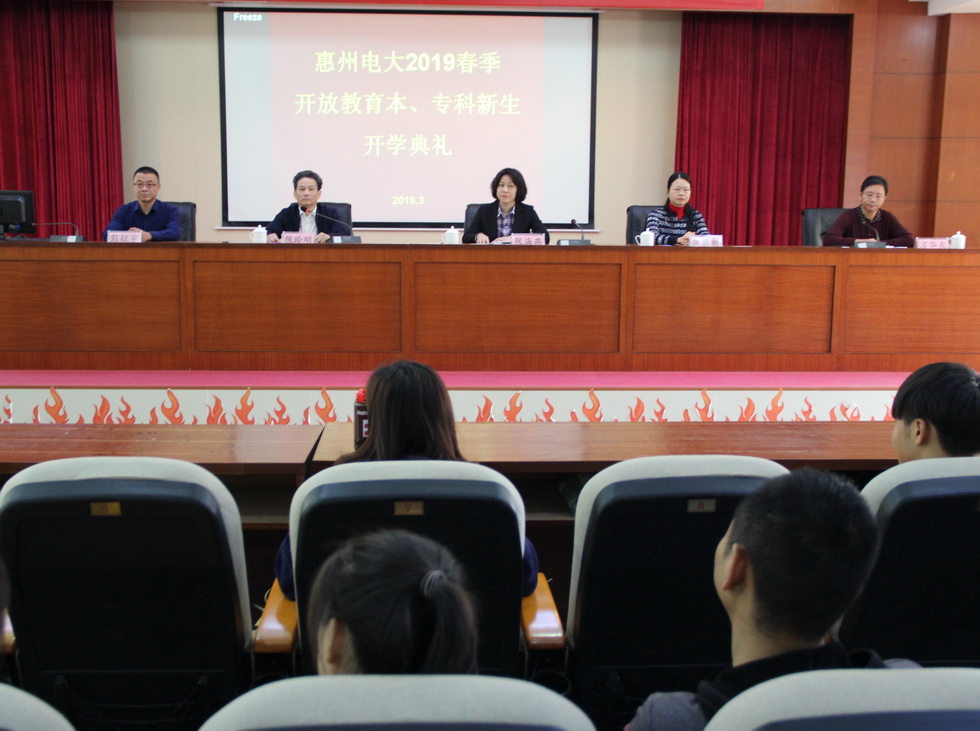 3月23日,惠州电大在12楼多功能会议厅举行2019年春季开放教育新生开学典礼。党委书记、校长张海燕,副校长范慧新、陈玲明,相关科室负责人及开放教育班主任、全体新生参加典礼。