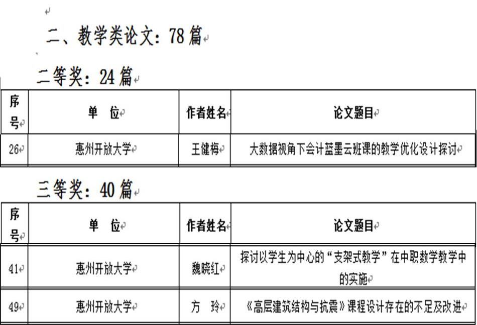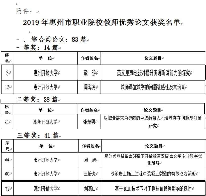 近日,在第十四届惠州市职业院校教师优秀论文评比中,我校教师喜获佳绩:熊珍、周海涛获综合类一等奖,张慧明获综合类二等奖,周妍、王培先、刘惠山获综合类三等奖。王健梅获教学类二等奖。魏晓红、方玲获教学类三等奖。
