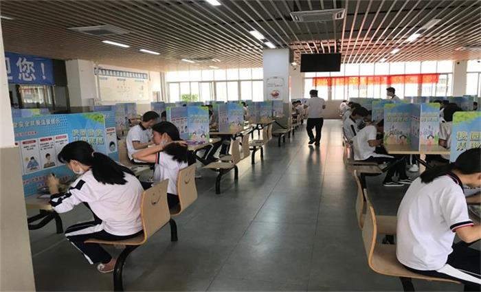 学校食堂采取分时段错峰就餐,学生分批次进入食堂,隔开就餐。严格要求学生带好口罩,有序排队。提前修建多个洗手池,提前标记排队距离,提前布置餐桌位置。严格实行学生南门进,北门出,取餐之后速入座,入座之后速进食的就餐规则;值班老师现场维持秩序,现场陪餐随时应对突发情况,确保师生就餐安全。