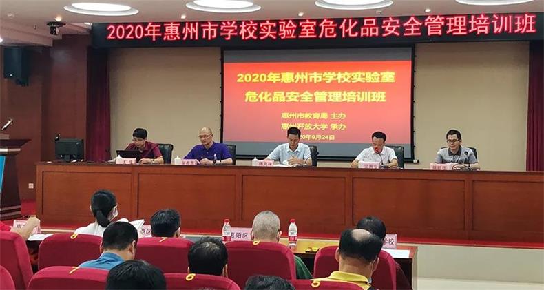 为加强学校实验室与危险化学品安全管理水平,提高学校安全事故应急处理能力,维护学校师生安全和校园稳定,9月24-25日,由惠州市教育局主办、乐竞体育平台官方网站承办的惠州市2020年学校实验室危化品安全管理培训班在乐竞体育平台官方网站顺利举行。