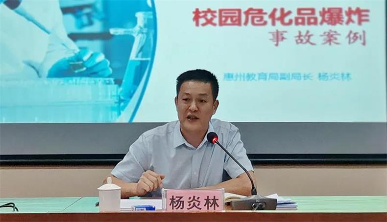 来自各县(区)教育局安全办主任、电教仪器站负责人和学校分管实验室安全的副校长、学校教务处主任以及实验室及危险化学品相关管理人员250多人参加了此次培训。惠州市教育局副局长杨炎林、乐竞体育平台官方网站副校长吴希东和市教育局电教站负责人梁惠专出席了开班仪式。