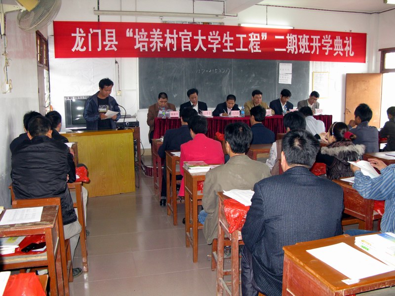 龙门电大陈耀深校长代表全校教职工欢迎各位村官加入电视大学这个大家庭。他向大家简要介绍了龙门电大的基本情况,指出“培养村官大学生工程”是龙门电大服务地方、落实办学理念及校地合作的一个重大项目,具有十分重要的意义。龙门电大在龙门县构建学习型社会和终身教育体系中扮演着重要的角色。同时,他还对新生提出了相关要求。接着,龙门县委组织部刘剑锋科长对获得二期入学资格的村官班学员表示祝贺。希望被录取的新学员珍惜这次难得的机会,勤奋学习,全面提高自身的科学文化素质,提高服务群众的意识,做好广大群众致富奔小康的领路人。希望学员支持配合,使此次办班取得圆满功。并祝愿各位学员学有所成,为今后创造更加美好、更加辉煌的人生打下坚实的基础。