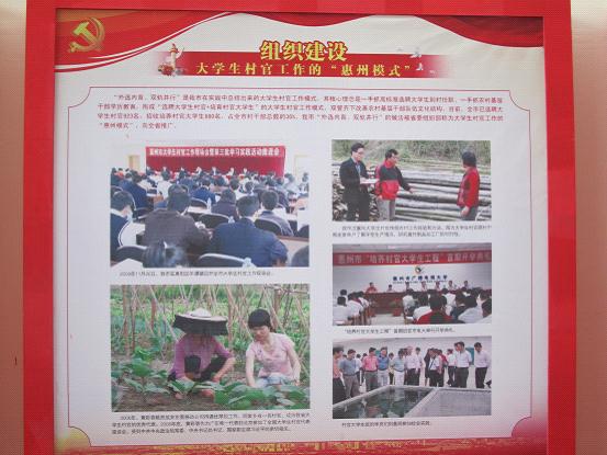 我校与市委组织部联合实施的“培养村官大学生工程”作为大学生村官工作的“惠州模式”在图片展上展出。