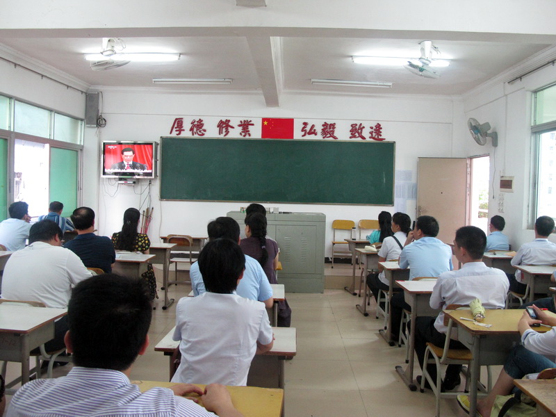 7月1日上午10 时,中共中央庆祝中国共产党成立90周年大会在人民大会堂隆重召开。中共中央总书记胡锦涛在大会上发表了重要讲话。惠州电大校长、党总支书记吴汉朋参加了在市政府行政中心举行的集中收看实况直播活动,其他校领导与全体教职工在教学楼2楼课室集中收看了大会实况,聆听胡锦涛总书记重要讲话。