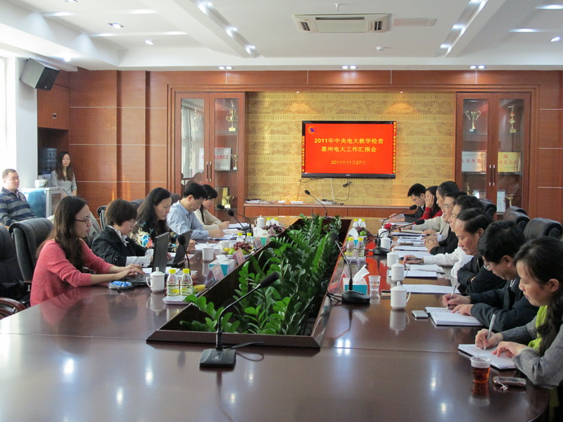 2011年11月27日,中央电大评估督导办主任郭青春带领中央电大教学检查组一行,在省电大教务处处长刘超球的陪同下,对我校2011年开放教育教学工作进行了检查对,并对我校申报第三批全国“示范性基层电大”进行了实地评估,我校党委书记、校长吴汉朋、副校长陈玲明、杨祖武、陈更海、张新华参加了自查工作汇报会。