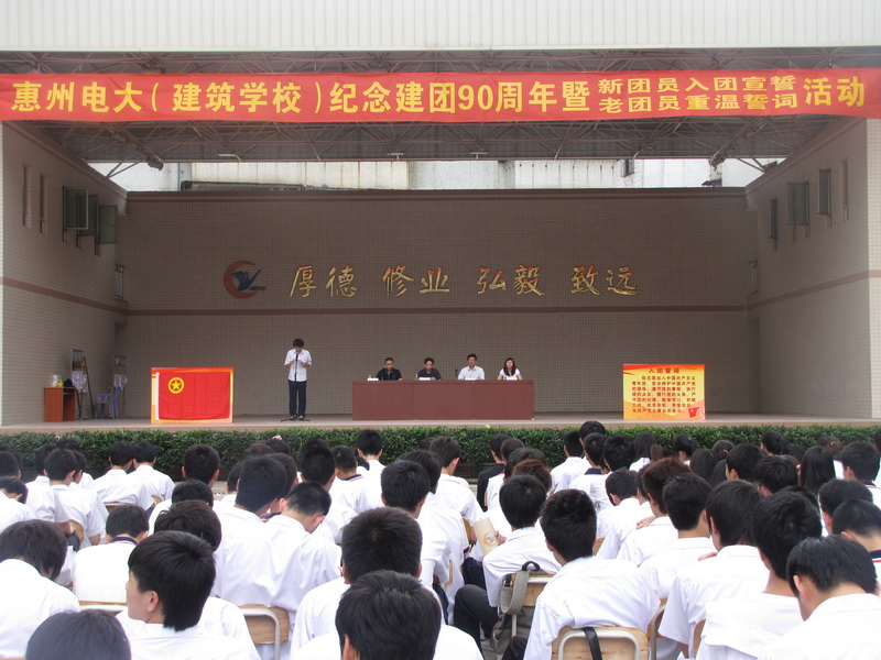 2012年4月25日下午,我校在文体中心举行纪念建团90周年暨新团员入团宣誓老团员重温誓词活动。建筑学校陈玲明校长、周坚副校长、团委王志生书记、黄丹宜副书记,新老团员共400多人参加了本次活动。王志生书记宣读了批准入团决定,黄丹宜副书记带领全体团员宣誓,新老团员代表分别作了发言。最后陈玲明校长讲话,并对全体团员提出了要求和希望:1、要严格按照《团章》规定,要求自己;2、要进一步加强团知识的学习,努力提高自身的思想觉悟,树立良好人生观和价值观;3、勤奋学习,尊敬师长,团结同学,遵守纪律,在学校各项活动中做好模范带头作用。4、希望符合条件的团员积极向中国共产党组织靠拢,争取成为一名优秀的共产党员。