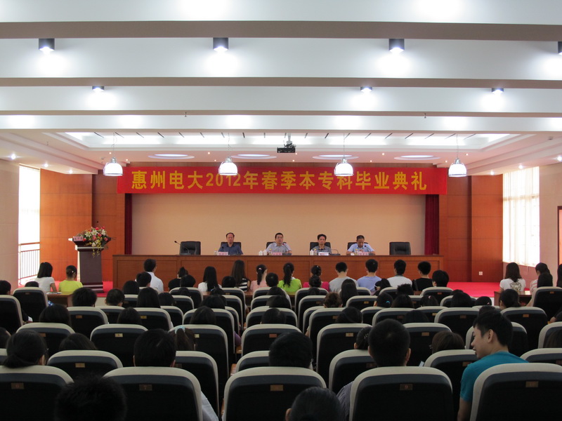 吴汉朋校长在毕业典礼上致辞,他代表全校教职工向720多名毕业生表示热烈的祝贺,向多年来为同学们的成长孜孜不倦、辛勤耕耘的所有老师致以最崇高的敬意!向全天下的父亲致以节日的问候。吴校长指出,三年来,市电大发生了大变化,实现了大跨越,与同学们一起茁壮成长:一是建成了惠州市直学校和我省地市级电大的标志性单体建筑,校园面貌“脱胎换骨”;二是形成学历教育、非学历教育及社区教育并举的格局;三是“六大改革”、“六大产品”激发生机活力,拓展办学空间;四是“培养村官大学生工程”和 “社区干部素质提升工程”享誉全国,各级领导高度重视,社会各界广泛赞誉。全市291名“村官班”首期学员顺利拿到大学文凭。这项工程培养了一批优秀村官,10级“村官班” 陈杏芬同学善于学以致用,大胆开展工作,带领村民奔康致富,成为了村民心目中的好村官,当选为十八大代表(全市仅3名代表);09级“村官班” 宏军挺作为全市唯一的一名农民党员代表出席了广东省第十一次党代会,凸显了电大在构建学习型社会和终身教育体系的主力军作用。“培养村官大学生工程”因其在提升农村基层干部整体素质中的关键和明显作用,还得到了市委“延长3年”的“特批”。五是惠州电大成功创建为全国示范性基层电大,加快转型升级,走在全省乃至全国电大同行前列。吴校长还简单通报了学校下来的打算与规划,并表示在国家、省筹建开放大学,惠州电大转型升级的背景下,学校的前景将更好,望同学们关心支持惠州电大的建设与发展!吴校长富有激情、幽默风趣的讲话赢来了学员们的阵阵掌声。