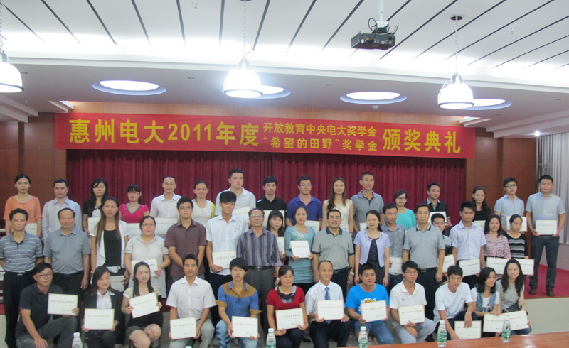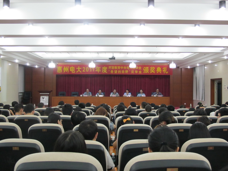 惠州电大校长、党委书记吴汉朋同志在会上发表重要讲话。首先,吴校长代表学校党委、领导班子向荣获两项奖学金的同学表示热烈祝贺。惠州电大学子获奖数量之多,规格之高,充分彰显了学校办学实力,尤其是荣获“希望的田野”奖学金的陈杏芬同学当选为党的十八大代表,全市仅三名,是广东省3名农村党代表之一,这不仅是个人的荣誉,更是全市电大系统乃至广东省电大系统的光荣与骄傲。