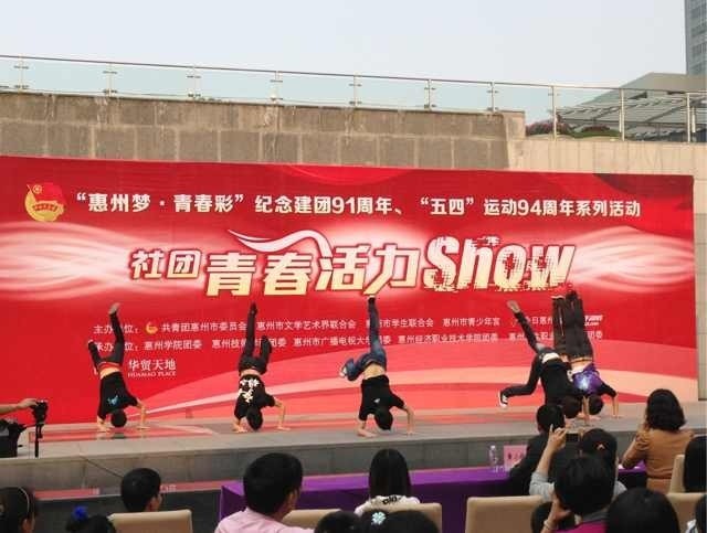 为纪念建团91周年、“五四”运动94周年,团市委、市文联、今日惠州网、西子湖畔和华贸中心等单位于2013年4月14日在华贸中心负一楼露天广场联合打造“惠州梦·青春彩”社团青春活力show活动。团市委书记张莉兰、市文联主席安想珍、华贸商业管理有限公司副总经理谢德敏和团市委全体成员出席了本次活动。