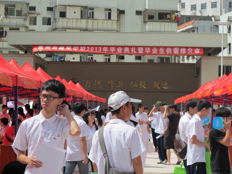 为加强学校与用人单位的联系,为毕业生(顶岗实习生)提供更好的就业机会,向社会输送更多更优秀的建筑人才,7月10日,市建筑学校(市电大中职)举行2013年毕业生(顶岗实习生)供需推介会。惠州市人才交流中心、惠州市电大(市建筑学校)有关领导出席典礼,150多家知名企业进场招聘,10级毕业生、11级顶岗实习学生共1200多人被争相聘用。