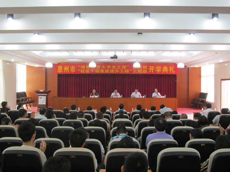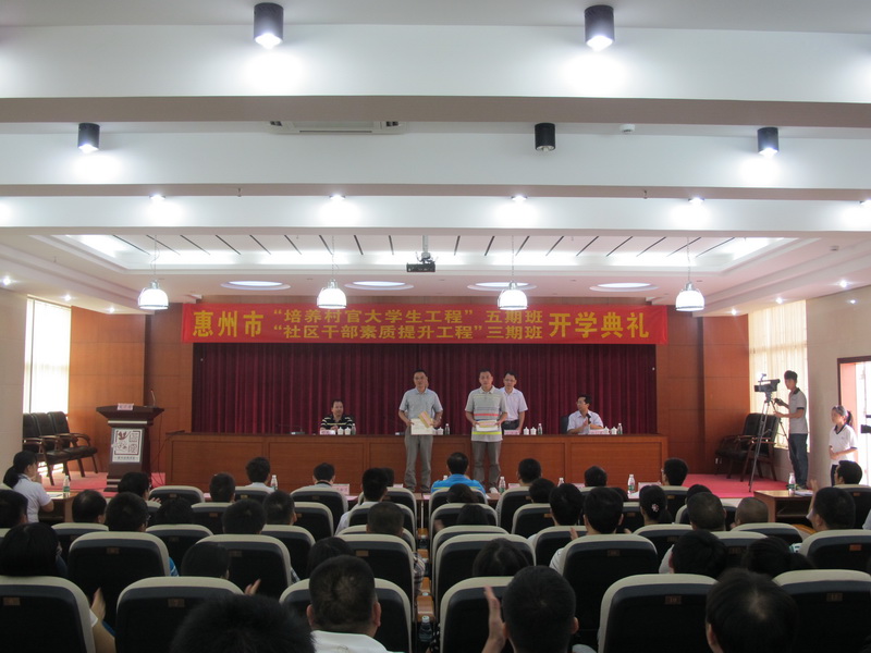 惠州市电大校长、党委书记吴汉朋同志向新学员们简要介绍了电大的办学情况、发展成果以及未来规划,总结分享了惠州市“培养村官大学生工程”、“社区干部素质提升工程”实施以来的办学经验:学员学费分级负担,课程设置比较科学,教学活动灵活多样,考核管理比较严谨。吴汉朋要求市县两级电大要从推进基层党建工作,创新农村、社区管理的政治高度,进一步创新教学形式,丰富教育内容,继续将这“两项工程”抓好、抓实、抓细。同时,还希望学员们端正学习态度,克服工学矛盾,拿到文凭,学到“真经”。