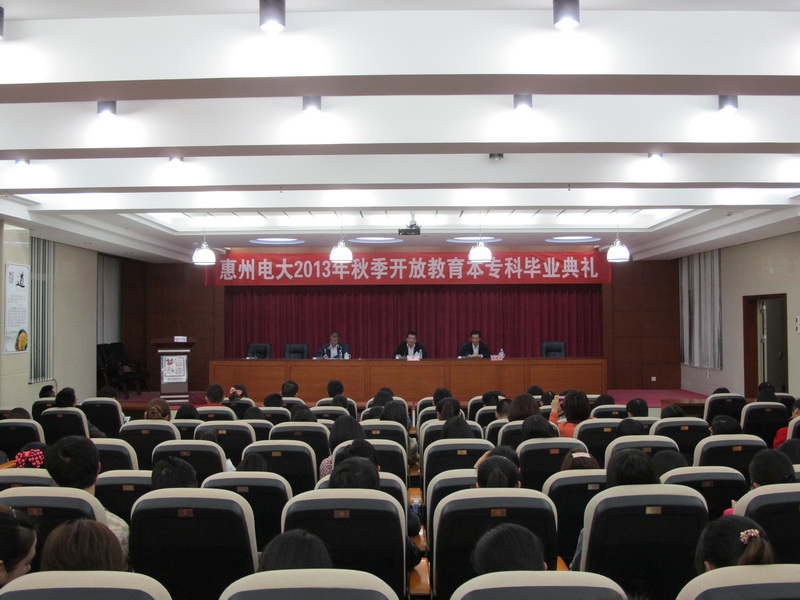 吴汉朋校长在毕业典礼上致辞。吴汉朋代表学校向顺利完成学业、取得毕业证书的432名学子们表示热烈的祝贺,向多年来支持学校发展的同学们表示感谢。吴汉朋与同学们分享了近三年来惠州电大的发展成果:建成了惠州市直学校和我省地市级电大的标志性单体建筑,基础设施迈上大台阶;“培养村官大学生工程”和“社区干部素质提升工程”享誉全国,得到社会各界广泛赞誉;拓展学历教育业务,办学规模不断扩大,招生连续几年名列全省地级市电大前列,协管惠州市干部网络大学堂,建立了惠州市“惠民终身学习网”,大大拓展学校的服务功能和办学空间,实现了与同学们一起茁壮成长。