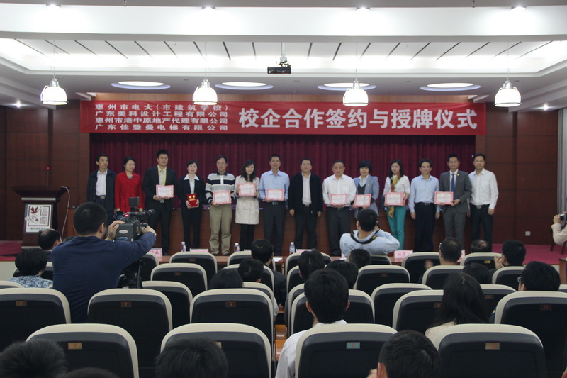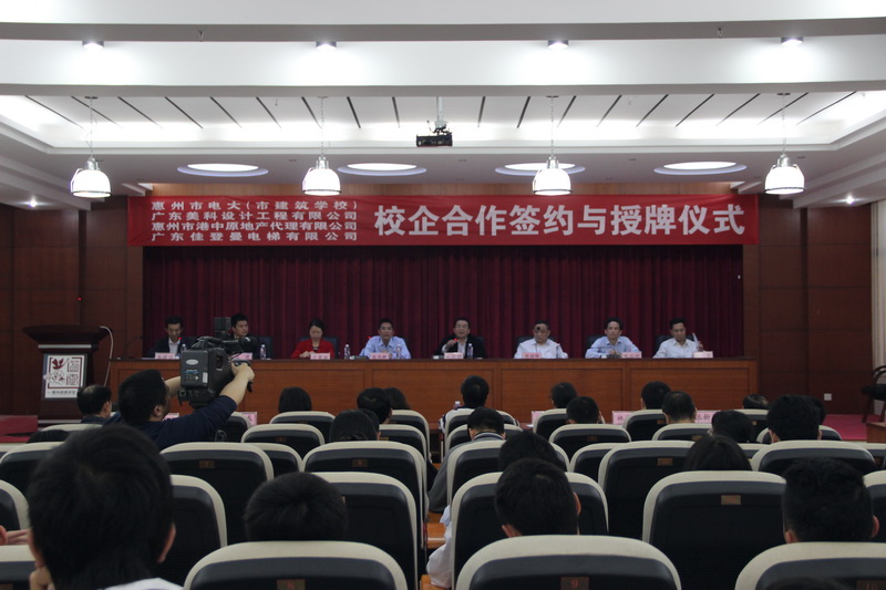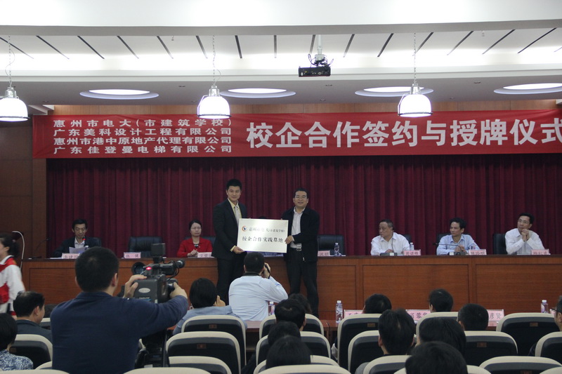 参加签字授牌仪式的有广东美科设计工程有限公司总经理陈伟群、惠州港中原地产有限公司事业部总经理张健、广东佳登曼电梯有限公司总经理周诺维,惠州市电大校长、党委书记吴汉朋,惠州市电大副校长、市建筑学校校长陈玲明等学校领导,以及双方部分中层管理人员和200多名学生代表。签字授牌仪式由惠州市电大副校长李建国主持。