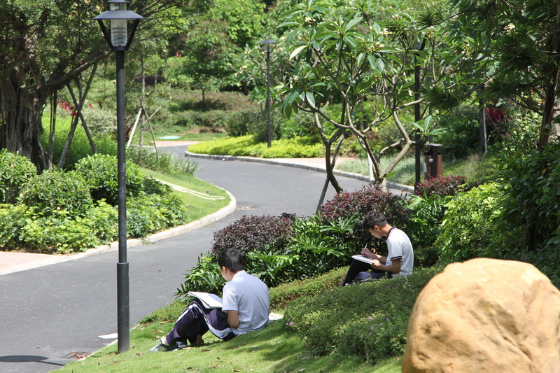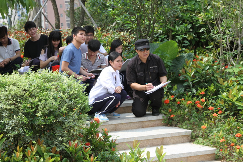 同学们在任课教师、班主任的带领下,一同走进了学校附近的成语公园,他们手持绘笔,三五成团,有的趴在台阶石凳上,有的席地而坐,寄情于花草树木间,将美丽的风景汇聚成图案绘制在那一张张洁白的画纸上,使一些简单的线条变成了丰富的图案。专业课老师从选景角度、透视构图、线条和色彩运用等写生技巧逐一点评和讲解,并现场作画指点迷津,为他们今后的学习生活提出好的建议,为其今后的设计生涯开了一个好的篇章。正如学生感言:“风景装饰了我们的写生板,而我们在装饰着自己的梦想”。