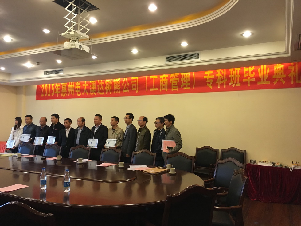 在毕业典礼上,陈日云先生结合自己的成长经历和公司的创立发展过程,说明了学习的重要性,并表达了对电大送教到企业的的感激之情,对员工坚持学习,继续参加本科班学习、提升学历层次和专业素质寄予了厚望。温金龙作重要讲话,他首先向澳达树熊公司(工商管理)专科班学员顺利毕业表示祝贺,向澳达树熊公司对市电大的支持和信任表示感谢,并要求学校进一步加强教学管理,为学员、为企业提供更好的服务,同时,衷心祝愿澳达树熊公司事业蒸蒸日上、更上一层楼!