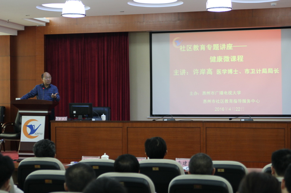 为了推广健康理念和保健知识,4月22日,惠州电大在综合楼报告厅开展社区教育专题讲座•“健康微课堂”活动,国务院特殊津贴专家、医学博士、惠州市卫生和计划生育局局长许岸高同志主讲。全体教职工、学生代表和河南岸斑璋湖社区居民近300人参加了讲座活动。