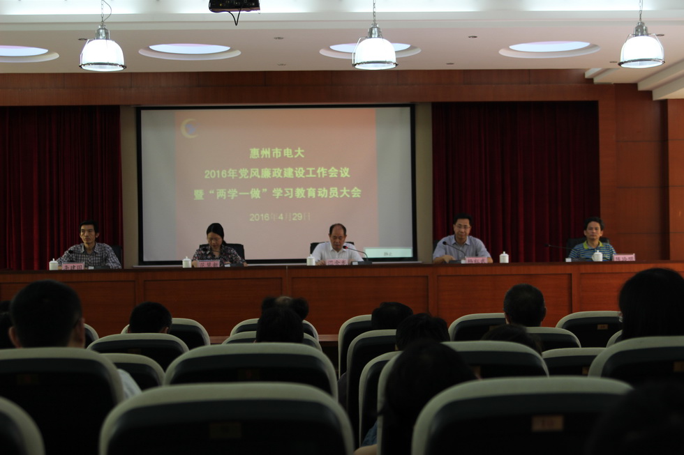 4月29日,惠州电大(建筑学校)在综合楼12楼多功能报告厅召开党风廉政建设工作会暨“两学一做”学习教育动员大会,学校党委书记、校长温金龙同志围绕抓好学校2016年度党风廉政建设工作和“两学一做”学习教育作讲话。会议由党委副书记、副校长、纪委书记杨祖武主持,学校领导班子成员、全校中层干部、党支部委员、全体党员参加了会议。