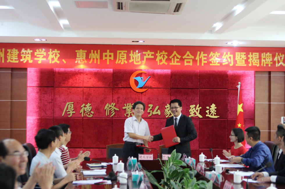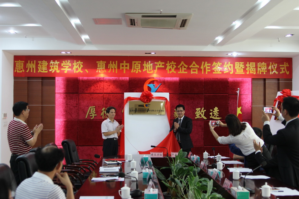 6月15日,惠州市建筑学校(市电大中职部)与惠州中原地产有限公司校企合作签约暨揭牌仪式在综合楼十一楼会议室举行。惠州电大副校长、建筑学校校长陈玲明,建筑学校副校长周坚,惠州中原地产有限公司董事、总经理钟志斌,高级人事经理刘金玲,学校和企业相关科室(部门)负责人参加了此次活动。