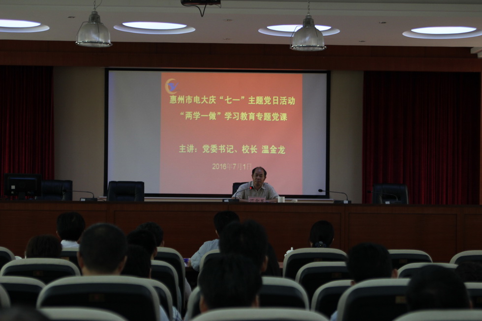 7月1日下午,惠州市电大开展庆“七一”主题党日活动,学校党委书记、校长温金龙以《新时期电大教工党员服务师生的意识要更强、行动要更自觉》为题,为全校党员上了一堂党课,就“两学一做”学习教育开展专题辅导。